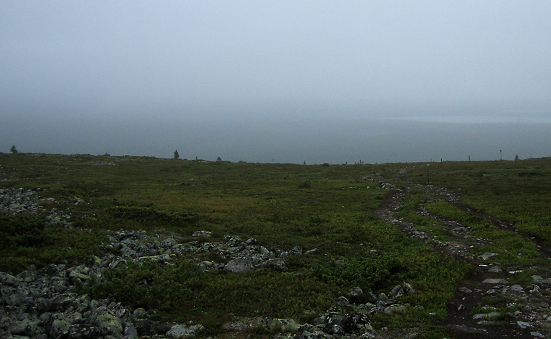 Ylläsjärvi näkyy sumun ja sateen keskeltä - liukasta polkua